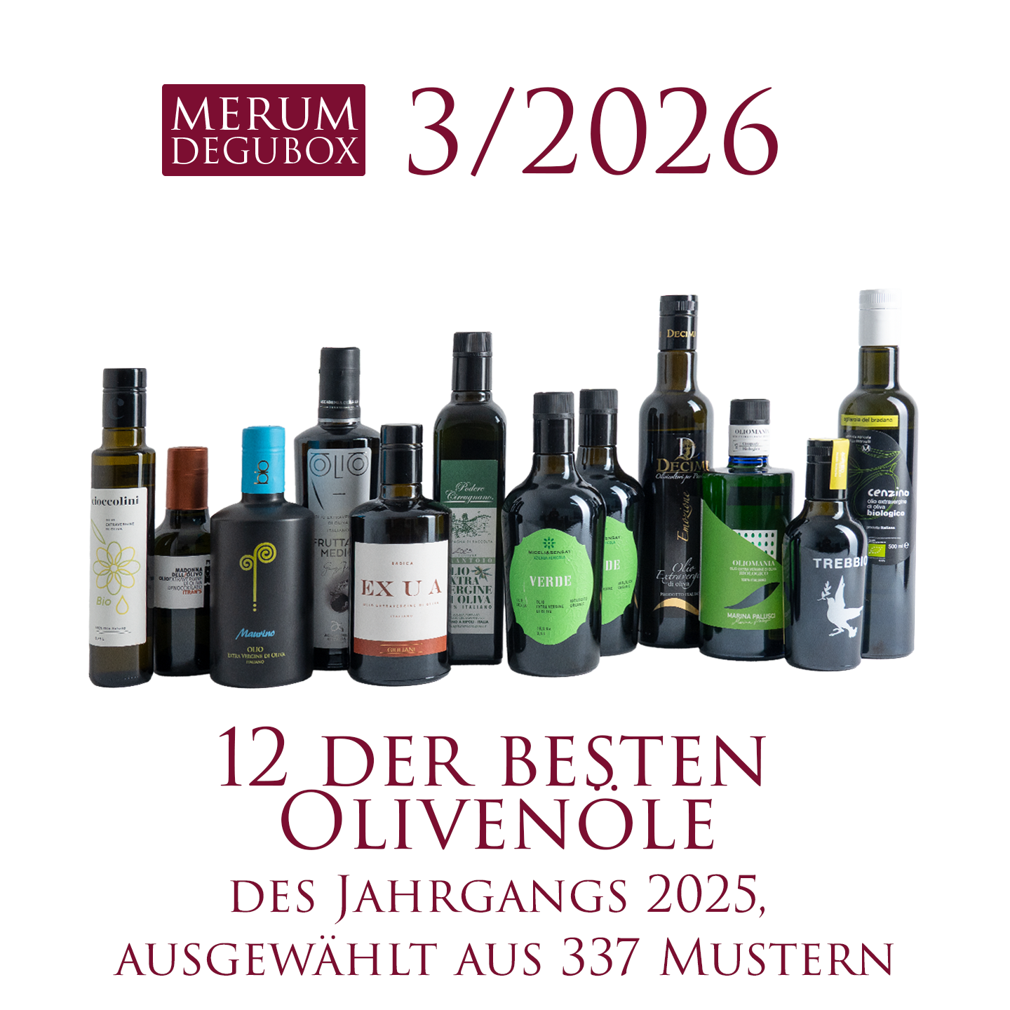12 Spitzenöle (0,5 l) des Jahrgangs 2025 (51,50 €/l inkl. USt, zzgl. Versand):
